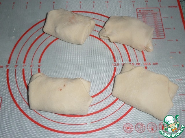 Пласт слоёного теста слегка раскатываем. Разрезаем на 4 квадрата.