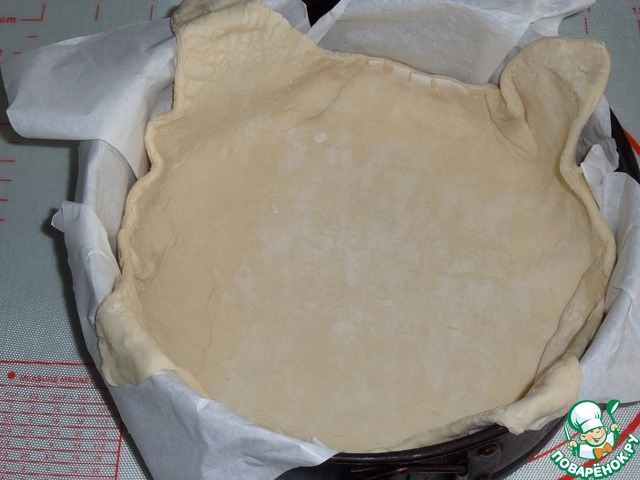 Пласт слоеного теста слегка раскатываем с помощью скалки и переносим в форму для выпечки, застелив ее пергаментом. Формируем бортики.