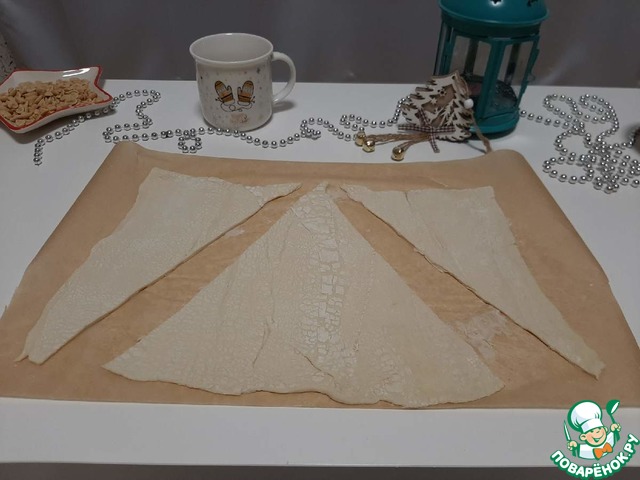 Делим на две части. Из одной части пласта теста вырезаем треугольники.