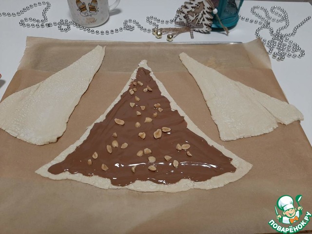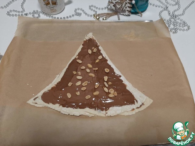 Из второй части теста вырезаем еще один треугольник и выкладываем поверх шоколада и арахиса.