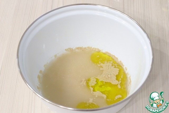 В миску добавить теплую воду (130 гр.), добавить дрожжи (4 гр.), добавить 30 гр. оливкового масла, добавить 1 щеп. соли. Смесь размешать.