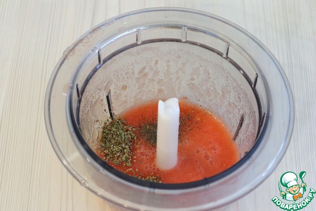 Помидоры обдать кипятком, снять шкурку. Помидоры нарезать кусочками, поместить в чашу измельчителя, добавить соль, сахар, черный молотый перец по вкусу. Далее добавить 1/2 ч. ложки орегано.