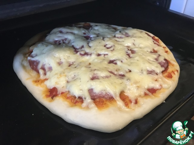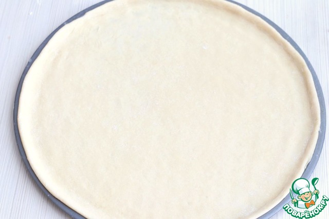 Тесто раскатать в пласт., поместить в форму для пиццы (диаметр формы для пиццы 30см.)