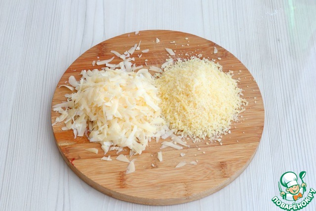Пармезан и голландский сыр натереть на терке, перемешать.