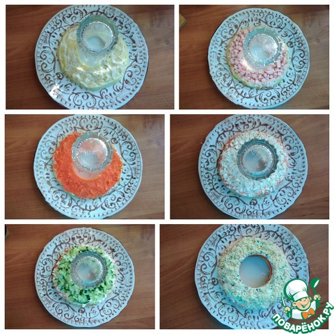 Салат собираем слоями. Я буду делать салат в новогоднем декоре - в виде венка. Я взяла блюдо -24 см. По центру разместила стакан, дно которого D -7 см. Обмазала внешние стенки стакана подсолнечным маслом на высоту ~ 7 см. Так легче будет удалять стакан из собранного салата. У моркови отрежьте пару колец для декора. Картофель и морковь натёрла на средней тёрке. Желтки отделила от белков. Белки мелко порубила, а желтки натёрла на мелкой тёрке. Ветчину и огурец порезала очень мелким кубиком. Собираем салат.