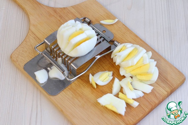 Яйца (3 шт.) отварить, нарезать соломкой.