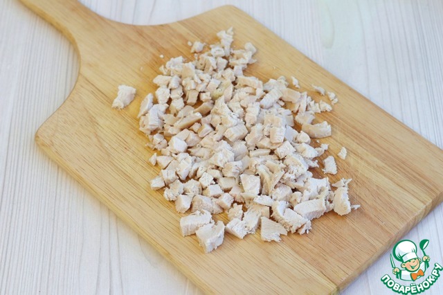 Филе куриной грудки (200 гр.) отварить в подсоленной воде, затем нарезать кубиками.