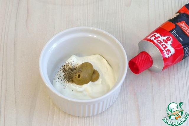 В миске соединить сметану (3 см. ложки), горчицу ТМ "Haas" (1 ч. ложка), добавить по вкусу соль и черный молотый перец. Смесь размешать.