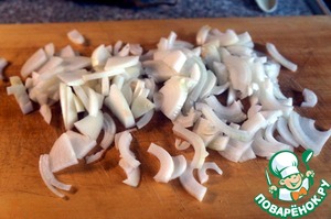 В той же сковороде, в которой жарилось мясо, снова разогреть масло (можно добавить), обжарить оставшийся лук. Можно использовать и лук из маринада.