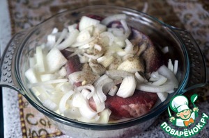 В емкость для маринования уложить мясо, засыпать половиной лука, влить вино, оставить на час-полтора.