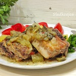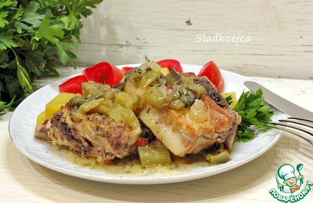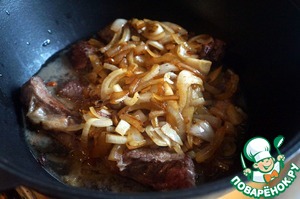 Добавить немного воды или бульона, посолить, разровнять соус, чтобы он равномерно покрывал мясо.