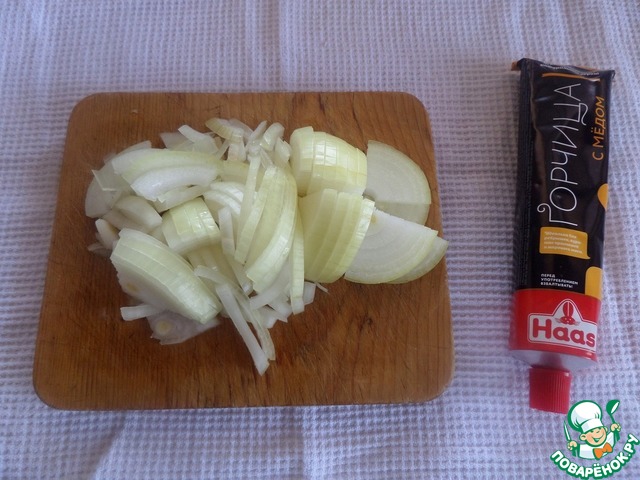 Подготовим продукты. Для приготовления блюда я буду использовать ароматную горчицу ТМ "Haas". Очищаем и нарезаем лук. Размораживаем грибы, у меня маслята. Отвариваем рис.