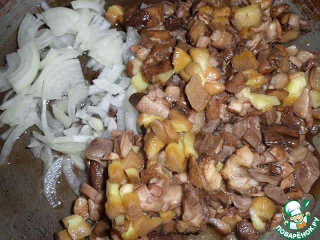 В разогретую сковороду наливаем 1 ст. л. растительного масла. Выкладываем 1 нарезанную луковицу и грибы.