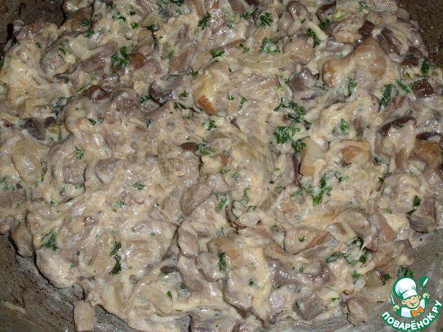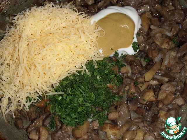 К обжаренным грибам добавляем сметану, горчицу ТМ "Haas", щепотку соли, нарезанную зелень (у меня петрушка), сыр.