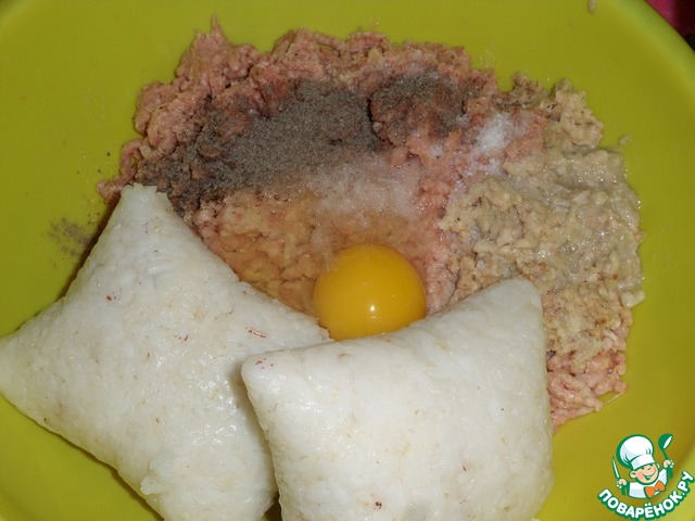 В чашку к куриному фаршу добавляем отварной рис, яйцо, 1ч. л. соли, перец черный молотый по вкусу.