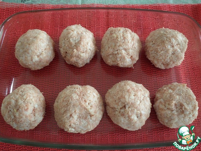 Из приготовленного курино-рисового фарша делаем шары. Выкладываем их в форму. У меня получилось 8шт. -