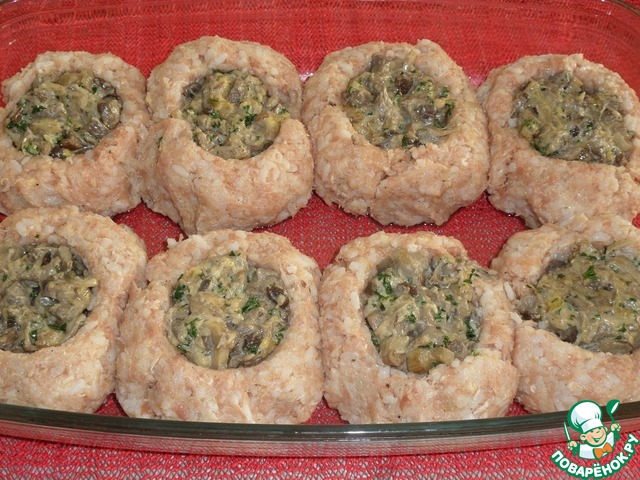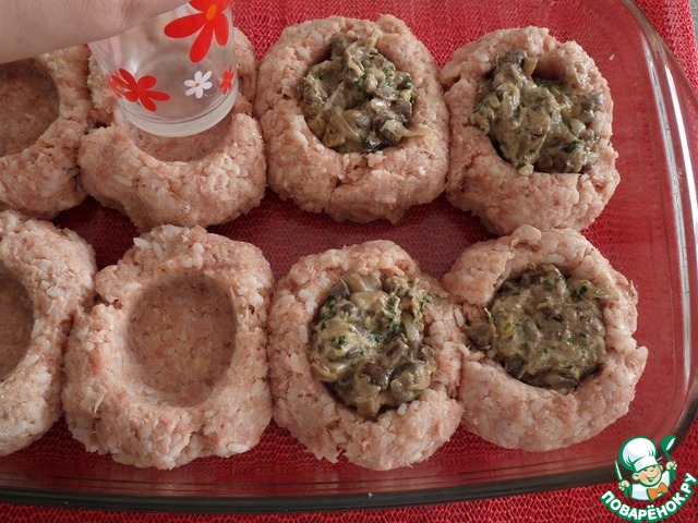 Затем с помощью стакана, смоченного водой, делаем углубления в каждом мясном шаре. В полученные углубления выкладываем приготовленную грибную начинку.