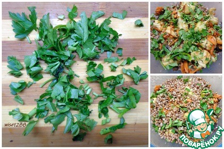 Петрушку мелко нарезать и положить на овощи, закрыть все оставшейся гречневой кашей. Запекать 15 минут при температуре 180 градусов.