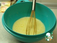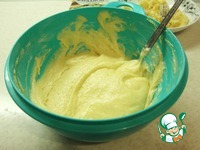 К жидким ингредиентам добавить муку с разрыхлителем. Размешать так, чтобы не было комочков в тесте. Оно получается немного гуще, чем на оладьи. |