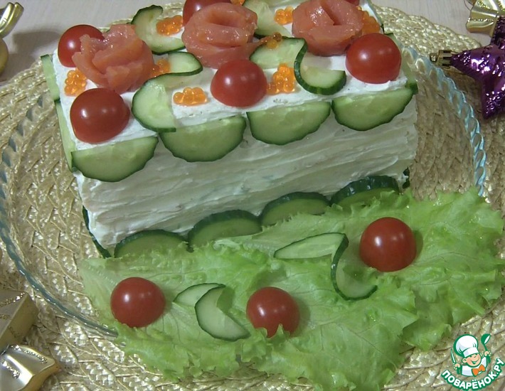 7. Украшаем по желанию! Я украсила свежим огурцом, помидорами черри и розочками из красной рыбы) и чуточку красной икры)