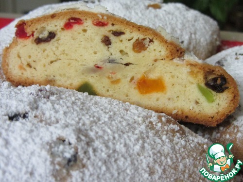 И обильно посыпать сахарной пудрой. Готовый штоллен в сахарной пудре я упаковываю в пекарскую бумагу, потом — в фольгу и кухонное полотенце. Убираю в прохладное место. Две, три недели достаточно для творожного штоллена. За это время он настоится и будет ароматным и вкусным.