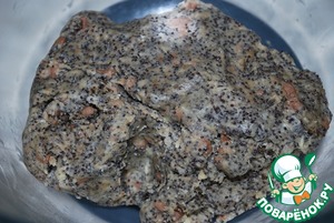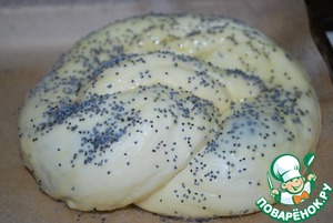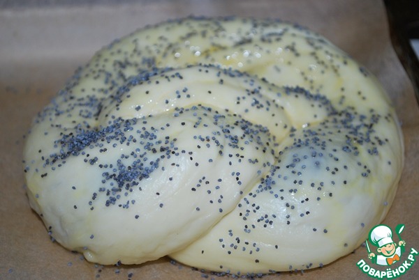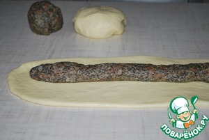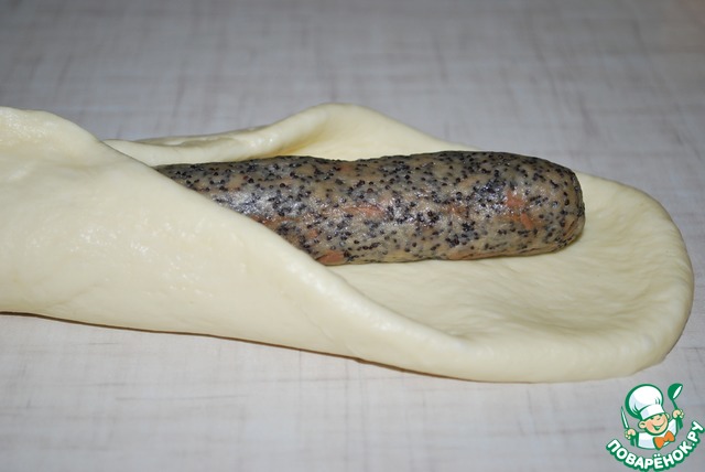 Раскатайте тесто в длинный пласт (тонко раскатывать тесто не надо). На середину теста выложите шоколадно-маковое тесто.