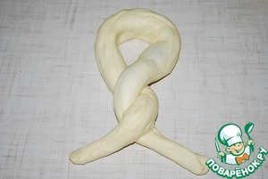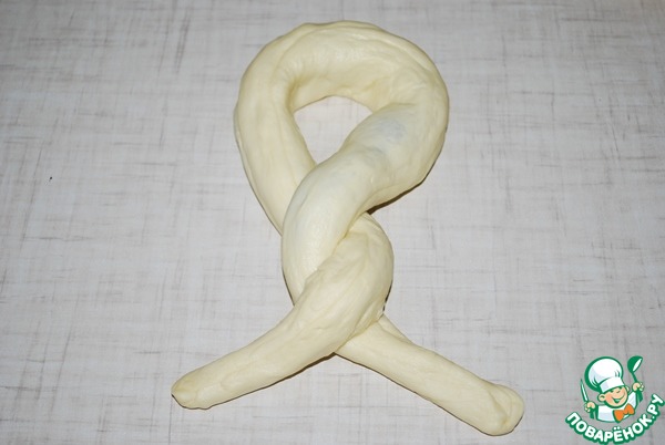 Раскатайте жгут. Заверните края, возьмите правую сторону и перекрестите, переверните вверх хвостики теста.