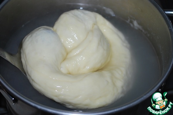 И сформируйте бублик-брецель. Края хорошо защипните, чтобы они при выпечке не разошлись. И даже если во время выпечки шоколадное тесто будет сочиться из булочек, это только придаст им красоты. В миску налейте горячую воду и размешайте в ней 2 чайные ложки соды. Окуните каждый бублик в горячую воду на 20–30 секунд.