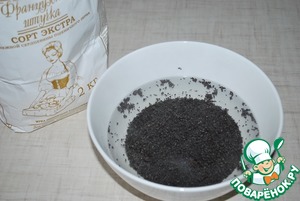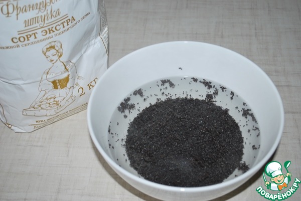 Пока тесто отдыхает, сделайте начинку. Для начинки я взяла мак и залила его кипятком. Шоколад порезала на кусочки (у меня молочный шоколад).