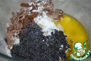 Для начинки смешайте масло и сахар, добавьте одно яйцо, перемешайте. Добавьте сироп ванили и муку с разрыхлителем. Добавьте мак (предварительно с мака слейте воду, чтобы она стекла) и шоколад.
