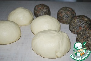 Тесто тем временем подошло, оно очень мягкое и нежное. Тесто и начинку разделите на 4 равные части