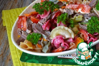 Этот салат делала мама... лет 25 назад, всем тогда понравился, но почему-то незаслуженно его забыли. Вот, сегодня решила вспомнить, может, конечно, что-то изменила. Дела давно минувших дней. Это прекрасная закуска на праздничном столе, благодаря её лёгкой кислинке и пикантному вкусу.