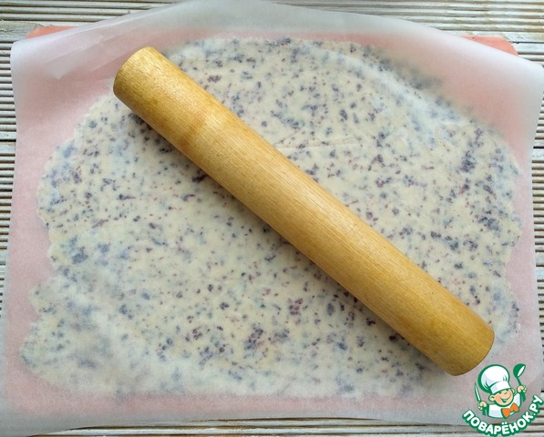 Тесто раскатать на между двумя листами бумаги для выпечки (я расскатывала на силиконовом коврике), толщиной 0.5-0.7 см. Перенести на противень.
