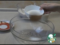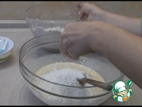 Сделаем опару, для этого раскрошим дрожжи, добавим 1-2 ст. л. сахара, зальем теплым молоком. Хорошо размешаем и добавим 2-3 ст. л. муки, еще раз размешаем. Муку и сахар берем из общей нормы. Накроем полотенцем и оставим на 15 минут.