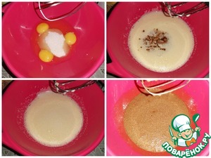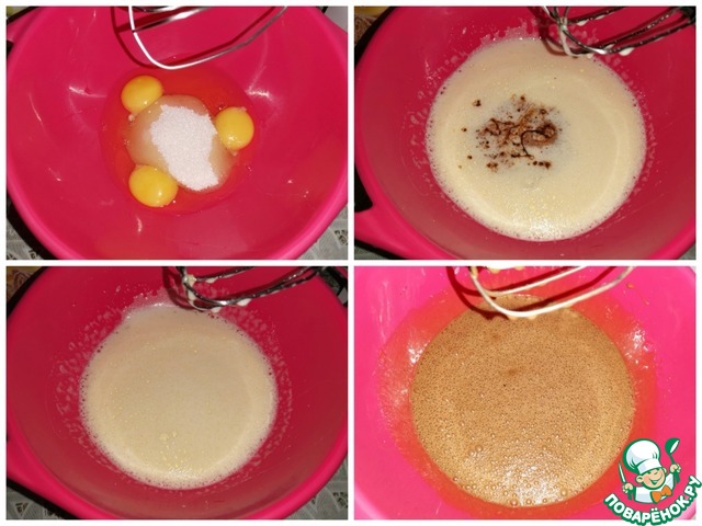 Взбить яйца с сахаром, солью и ванильным сахаром до побеления. Влить подостывшую шоколадно-масляную смесь. Взбить до однородной массы.