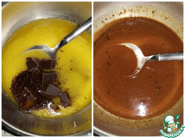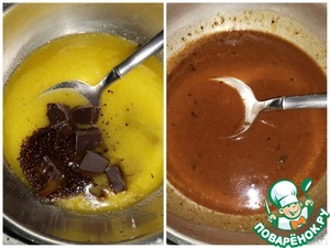 В растопленное сливочное масло всыпать кофе и поломанный на кусочки шоколад, размешать.