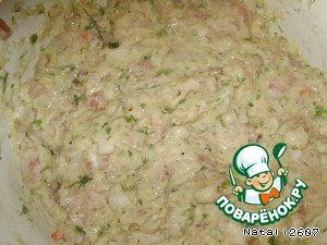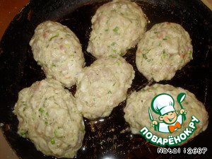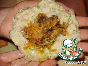 Взять немного рыбного фарша в серединку положить ложку начинки и сформировать котлетку.
