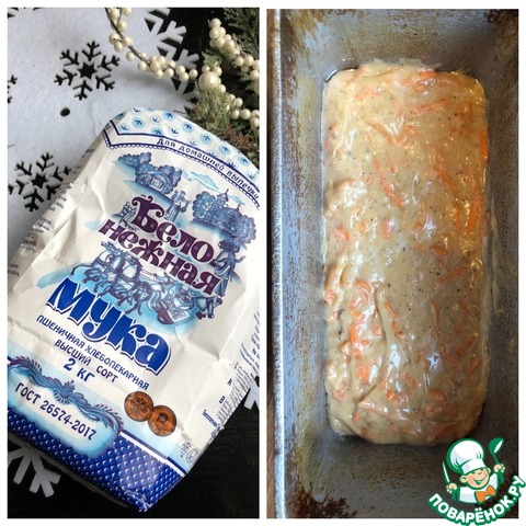 Морковь очистить и натереть на крупной терке. Добавить в тесто и перемешать лопаткой. Всыпать муку и разрыхлитель. Вымешиваем тесто лопаткой снизу вверх.