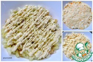 • Собрать салат: первый слой куриное филе с майонезом, второй слой кабачки с луком.