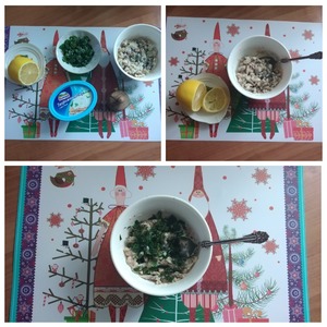 С рыбных консервов в с/с нужно слить жидкость. Выложить в посуду и размять вилкой. Разминать не нужно до однородной массы, пусть рыба останется волокнами. Из дольки лимона отжимаем сок, соединяем. Добавляем зелёный мелко порезанный лук.