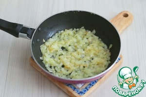 Репчатый лук (1 шт.) нашинковать мелкими кубиками. На сковороду добавить 1 ст. ложку топленого сливочного масла, добавить лук. Пассеровать лук до легкой золотистой корочки.