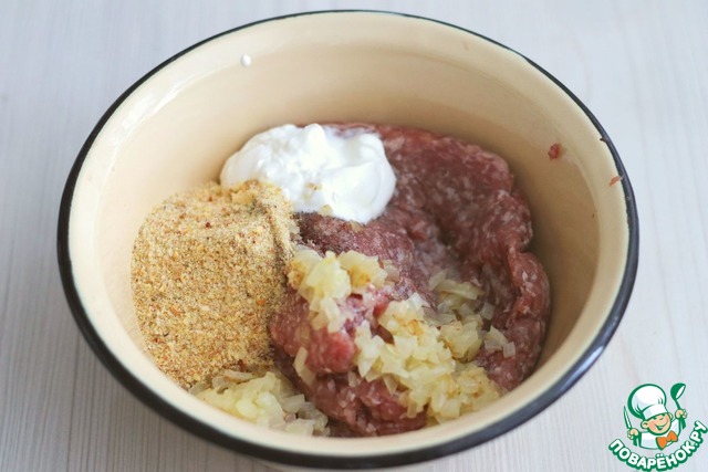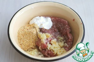 В готовый фарш добавить пассированный лук, панировочные сухари (2 ст. ложки), сметану (1 ст. ложка), соль и черный молотый перец добавить по вкусу.