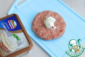 Из подготовленного для зраз фарша сформовать круглые лепешки, на середину каждой добавить смесь плавленого сыра и укропа. Края лепешки соединить по принципу пирожка.