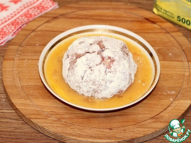 15. Затем макаем в взбитое с щепоткой соли яйцо.