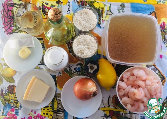 Ингредиенты для «Ризотто “Солнечное” с лимоном и креветками»: