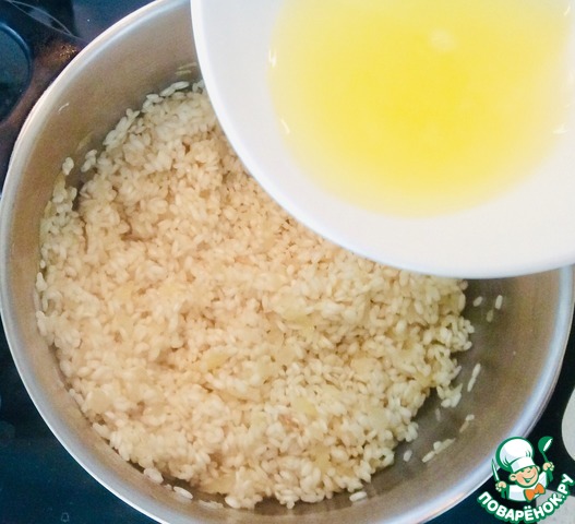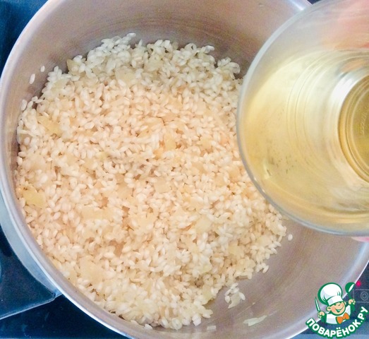 Добавить промытый рис и перемешивать, пока рис не станет слегка прозрачным. Добавить вино и не накрывать, пока спирт не испарится
