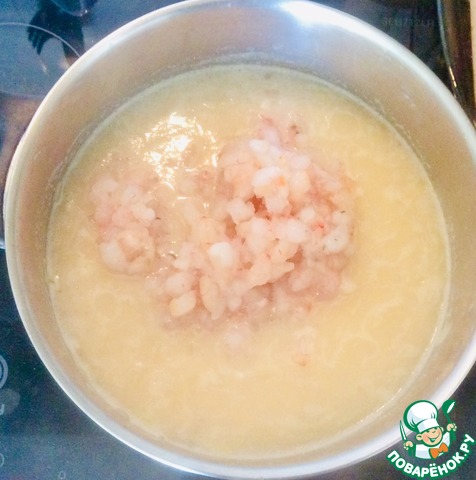 Нарезать половину креветок и добавить к рису, как только закипит бульон