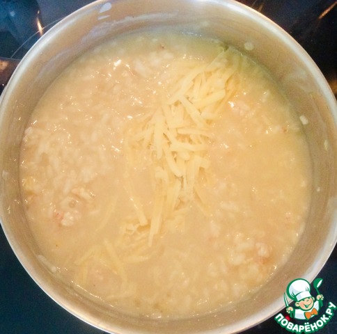 Попробовать пару рисинок на твёрдость. Если рис уже мягкий, можно добавить тёртый сыр. Небольшую часть сыра я тру на более мелкой тёрке и оставляю до момента подачи