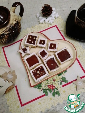 От теста отщипываем кусочек теста. Раскатываем и вырезаем вырубкой печенье любой формы. Сверху делаем ободок из вырубки меньшего размера. Накалываем внутри вилкой и отправляем печенье в морозилку на 15 мин. Затем выпекаем печенье при температуре 170 градусов около 20 мин. Охлаждаем и наполняем карамелью.