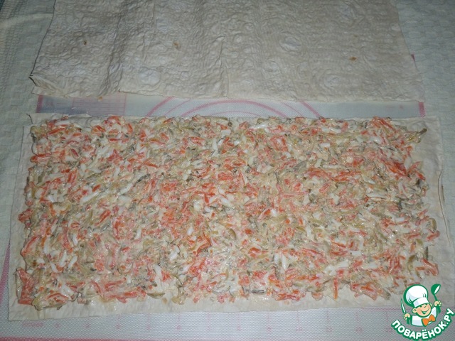 На лаваш выкладываем приготовленную начинку. Равномерно распределяем.